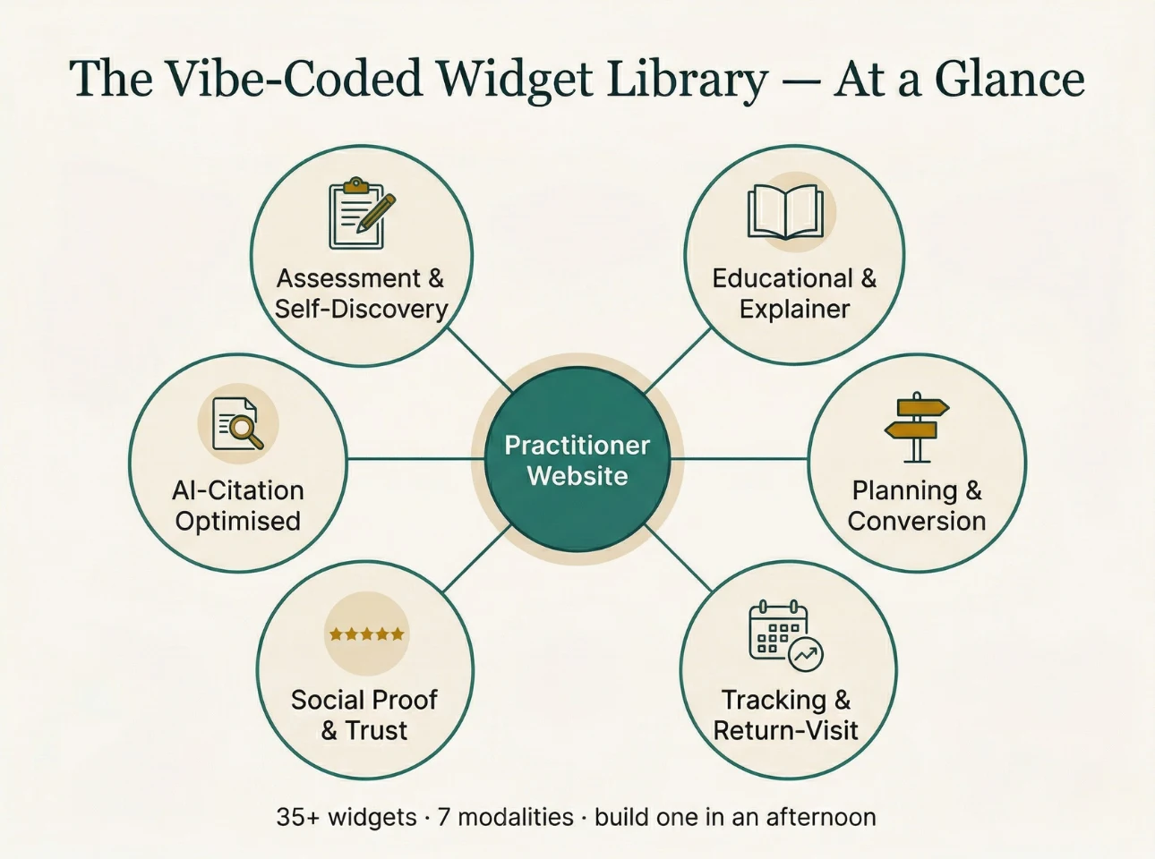 Static service pages tell. Widgets involve. They turn passive visitors into active participants — and active participants convert. A well-designed interactive widget can lift dwell time, capture leads at the moment of highest intent, generate FAQ-style content that AI systems love to cite, and differentiate a practitioner from every brochure-ware competitor.